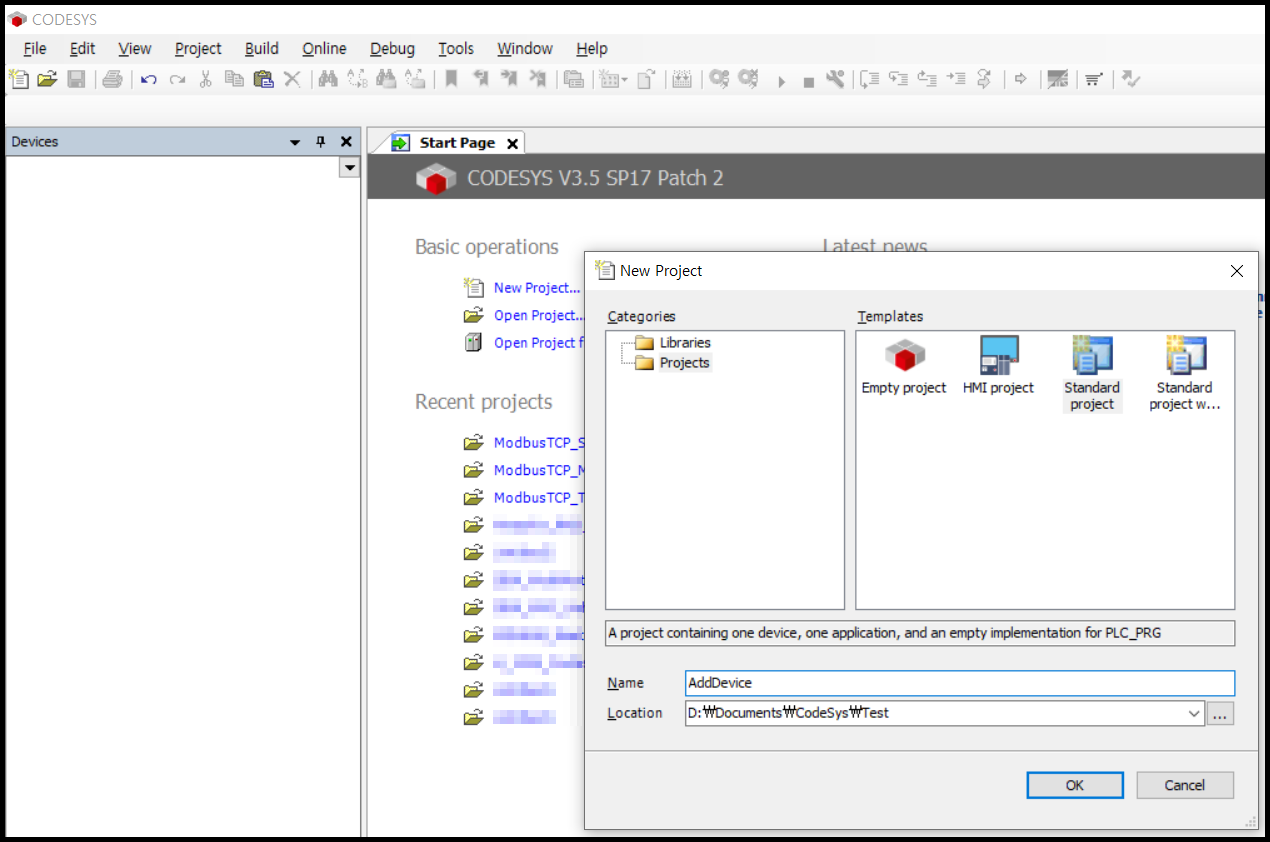 Codesys를 실행하고 새 프로젝트를 만듭니다.