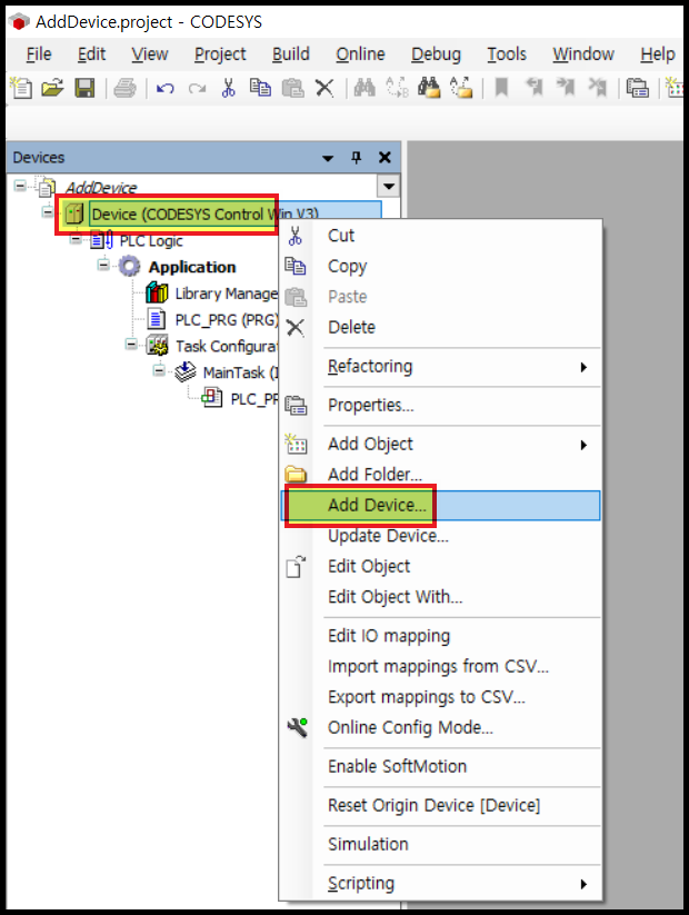 Device 를 마우스 오른쪽 버튼으로 클릭하면 메뉴가 나타납니다. [Add Device] 를 클릭합니다.