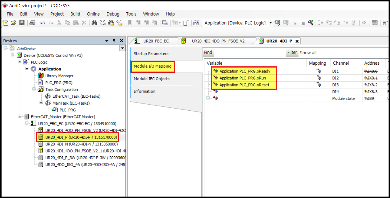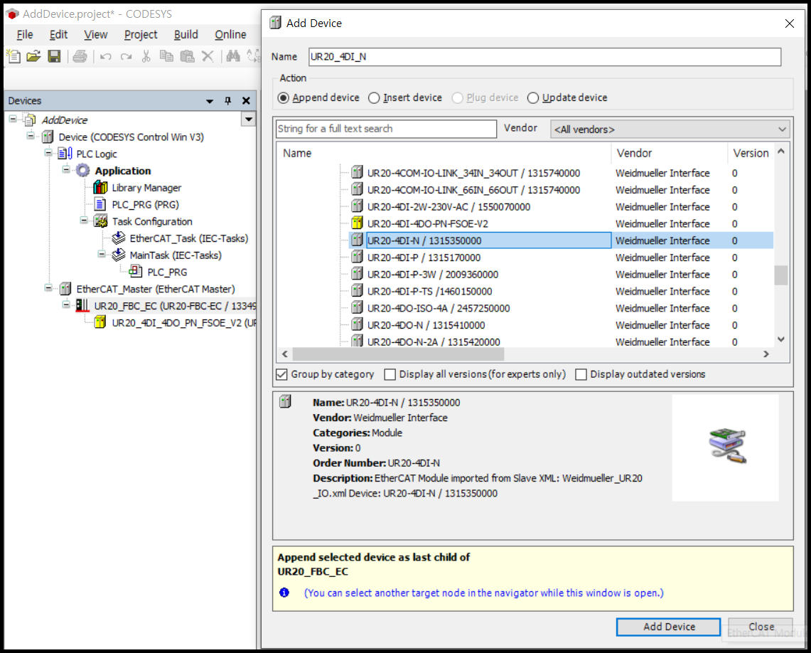 EtherCAT Bus Coupler를 먼저 추가하고, 그 아래에 I/O module 을 추가할 수 있습니다.