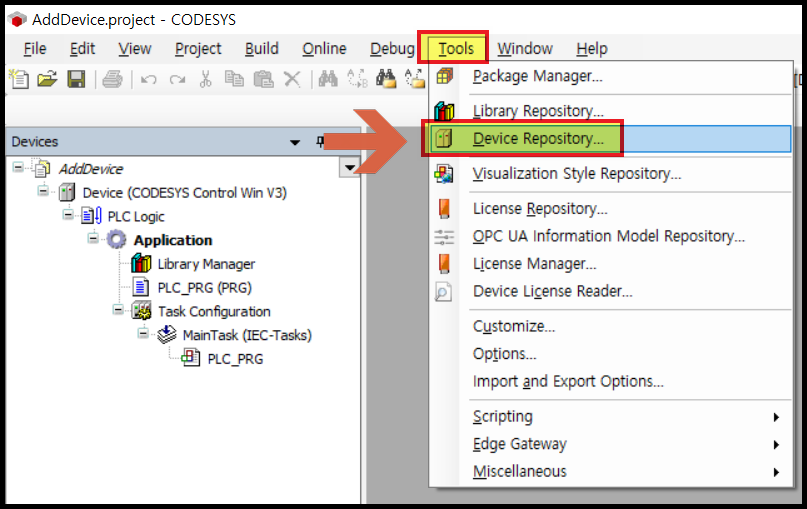 화면 상단 메뉴에서 [Tools] 를 클릭하고, 하위 메뉴의 [Device Repository] 를 선택합니다.