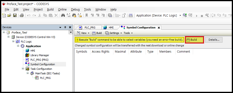 프로그램을 컴파일 하지 않은 상태라면, 위와 같이 Build 하라는 경고 메시지가 나타납니다.