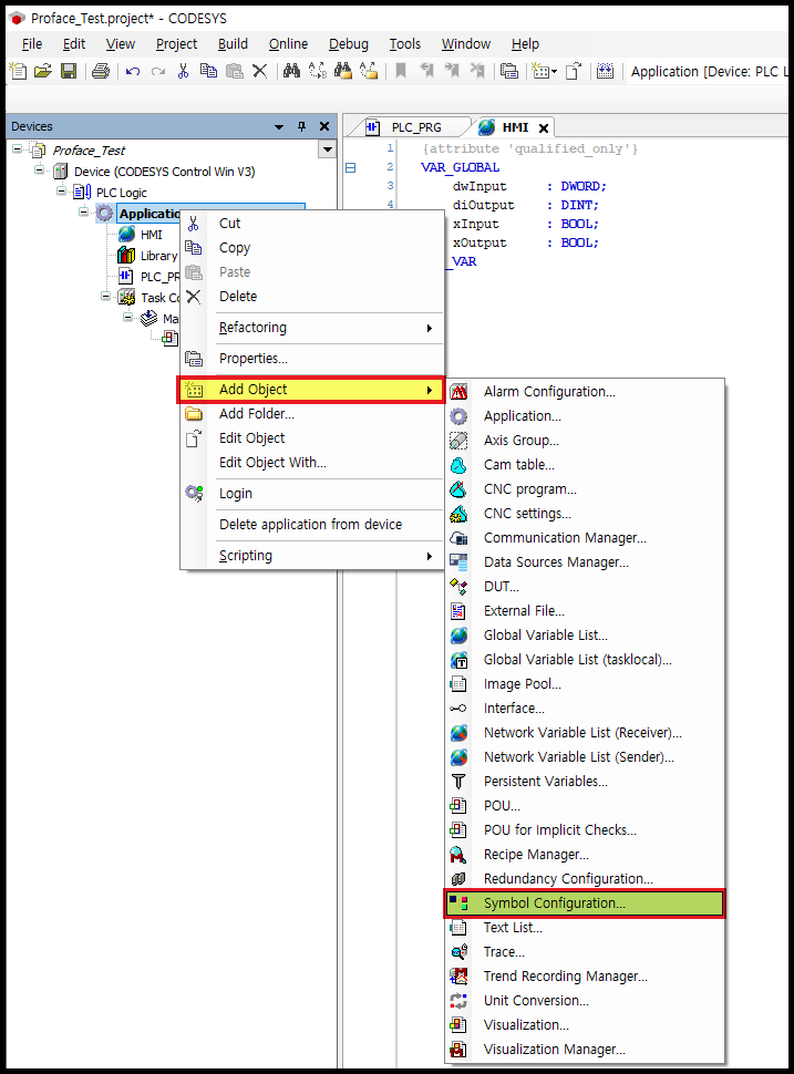 [Application] 을 마우스 오른쪽 버튼으로 클릭하여, [Add Object] - [Symbol Configuration] 을 클릭합니다.