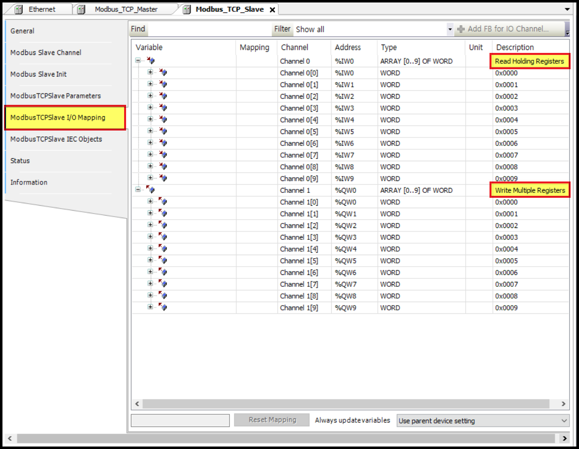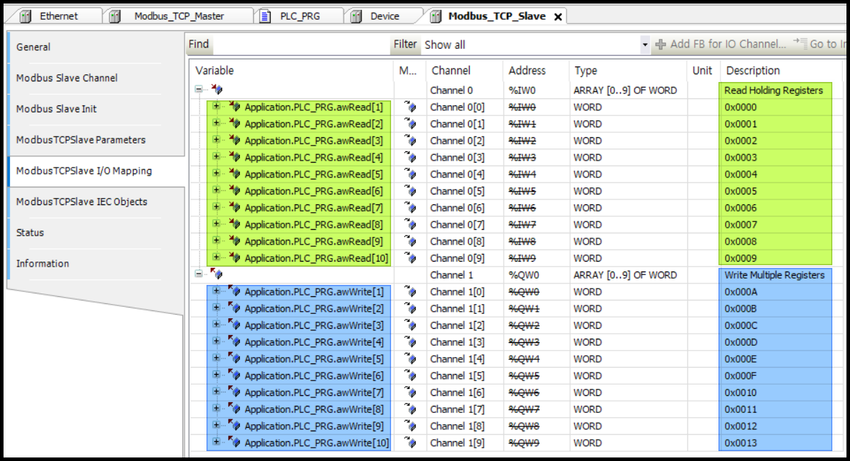 선언한 변수들을 [ModbusTCPSlave I/O Mapping] 에 할당하였습니다.
