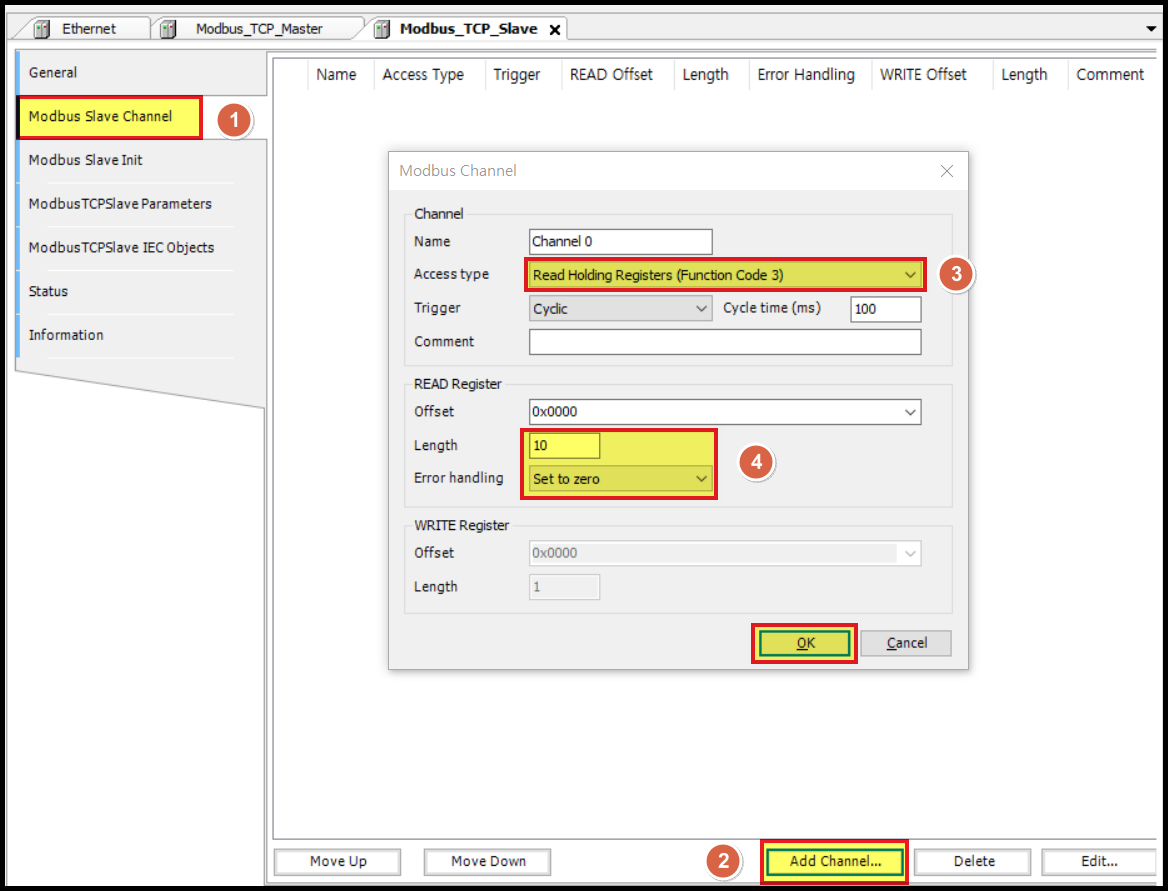 화면 하단에 [Add Channel] 을 클릭하면 [Modbus Channel] 창이 나타납니다.