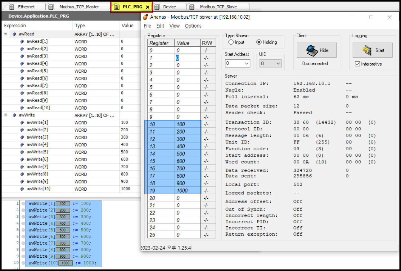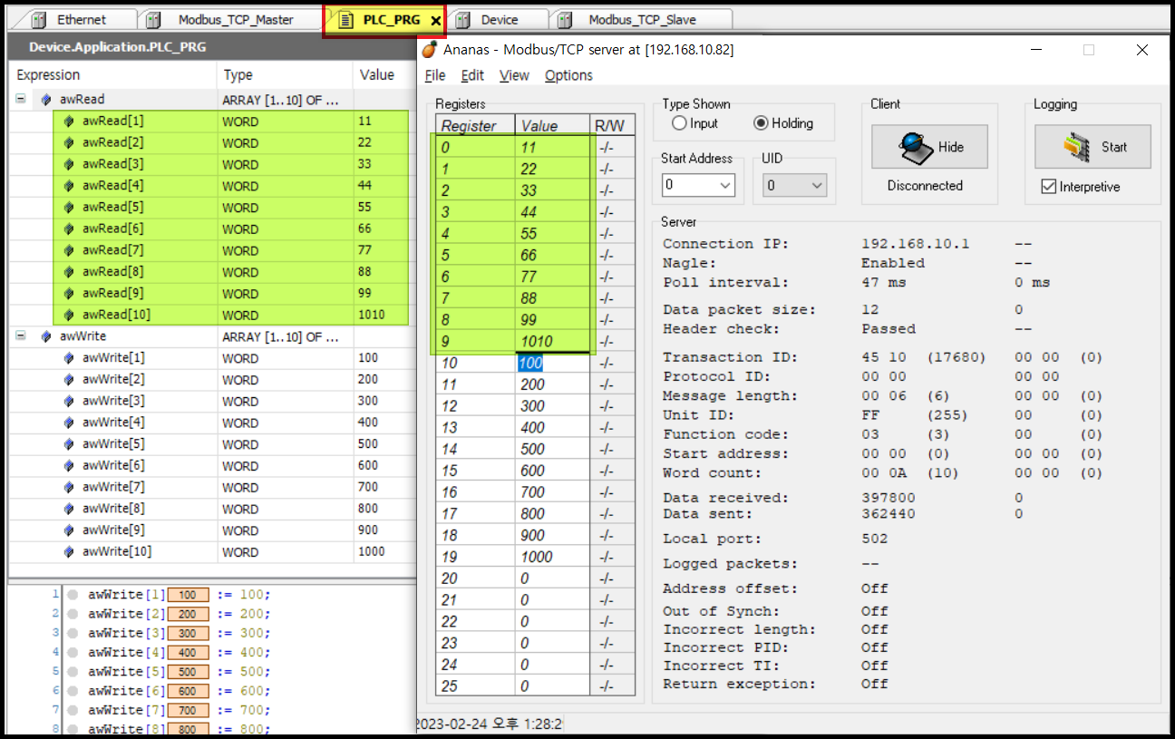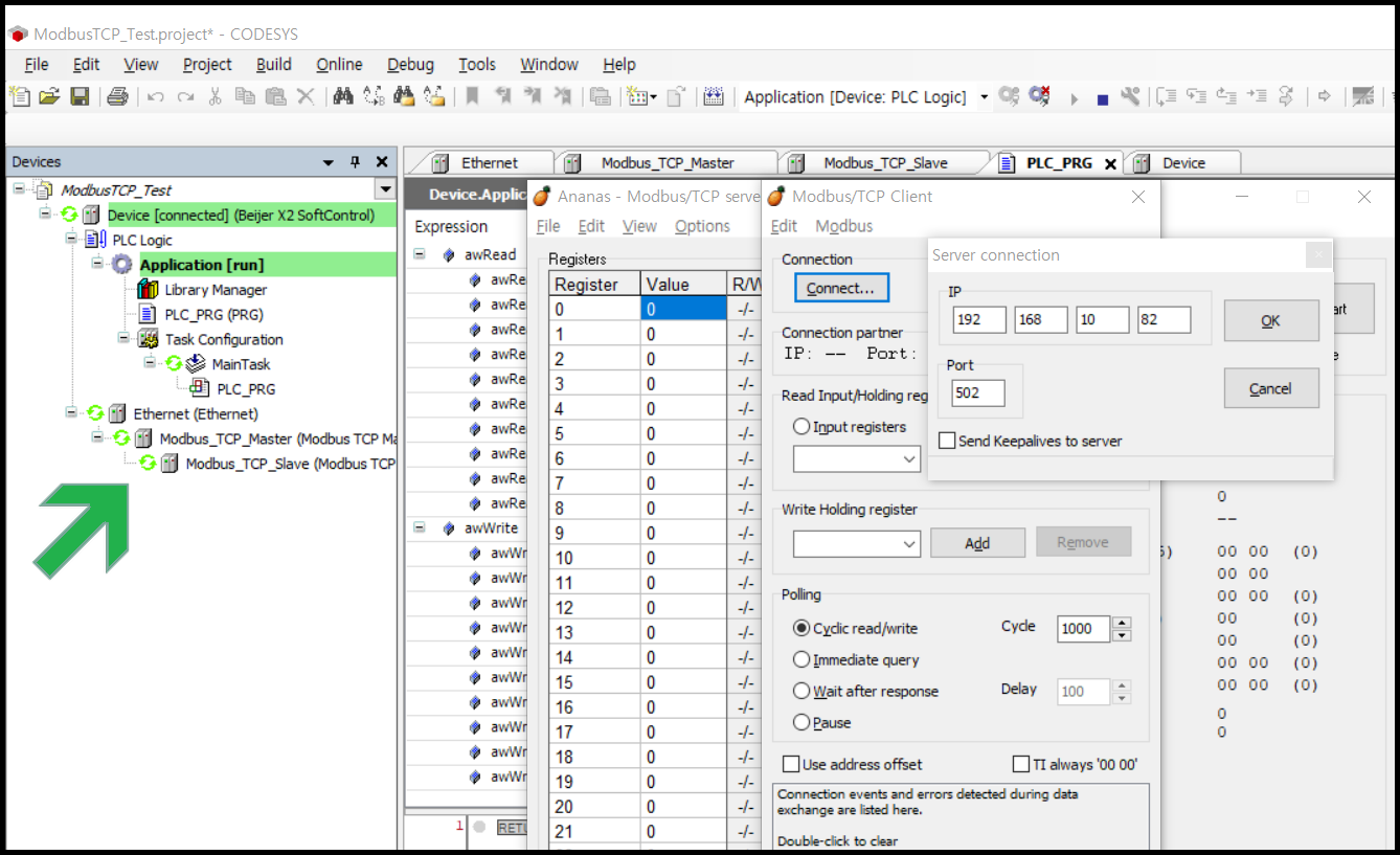 Modbus TCP Slave 시뮬레이터를 실행하자 제 컴퓨터와 Codesys Controller 통신연결에 성공하였습니다.