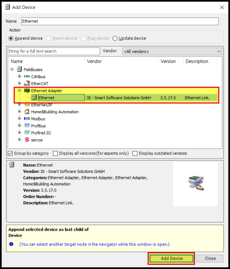 화면 좌측의 [Ethernet] 을 클릭하고 마우스 오른쪽버튼의 메뉴를 이용해 [Add Device]를 하면,