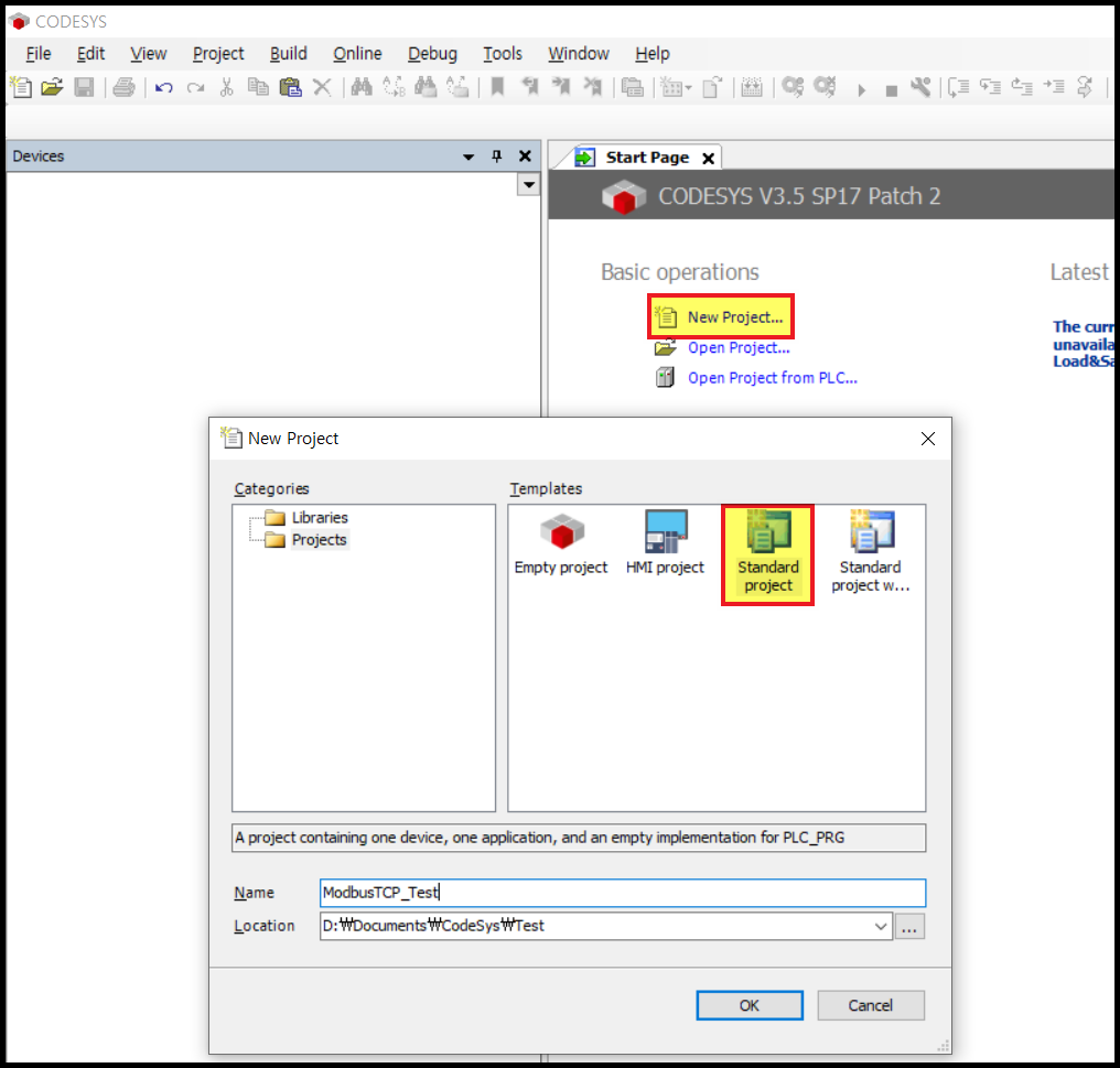 Codesys에서 새 프로젝트를 생성합니다.