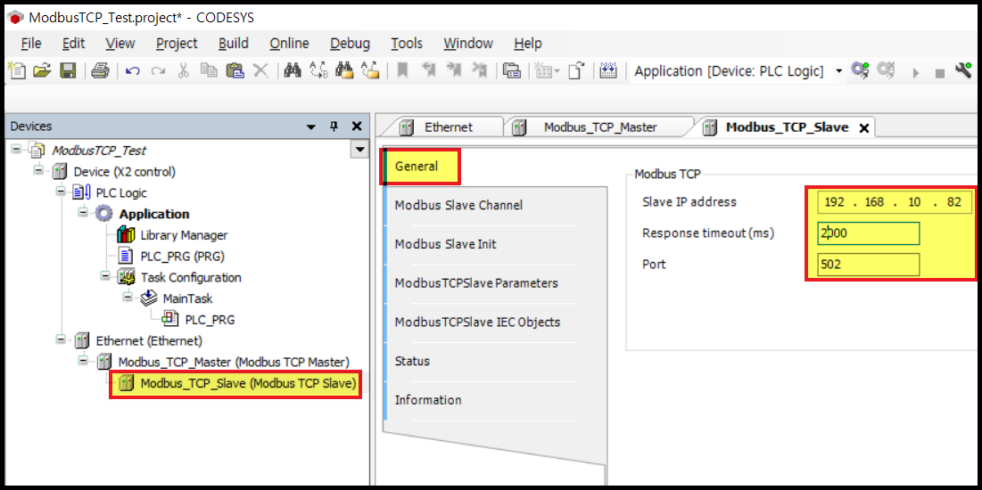 [General] 탭이 보입니다. 여기서는 Slave 장치의 IP와 주고 받을 데이터 등을 설정할 수 있습니다.
