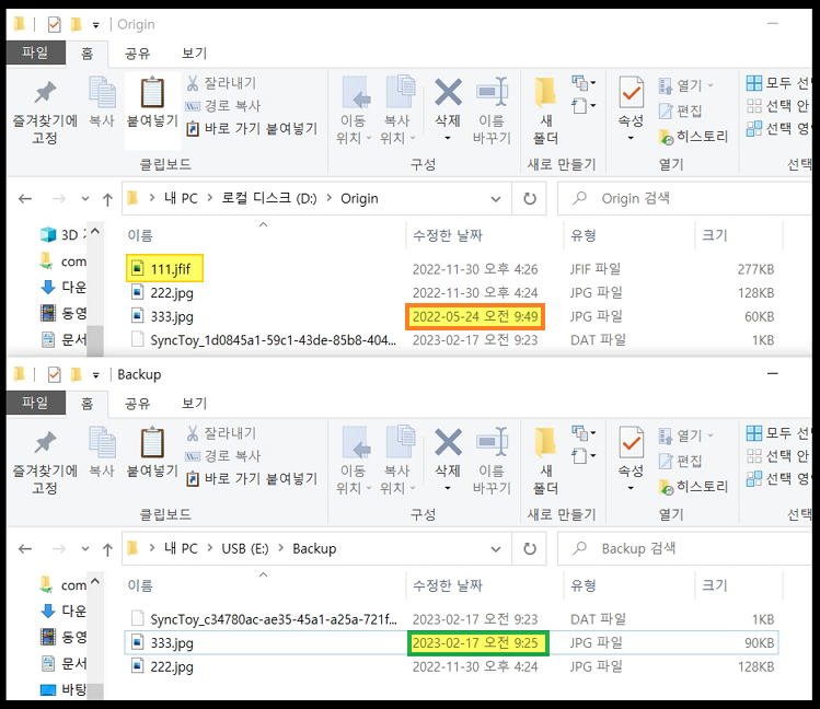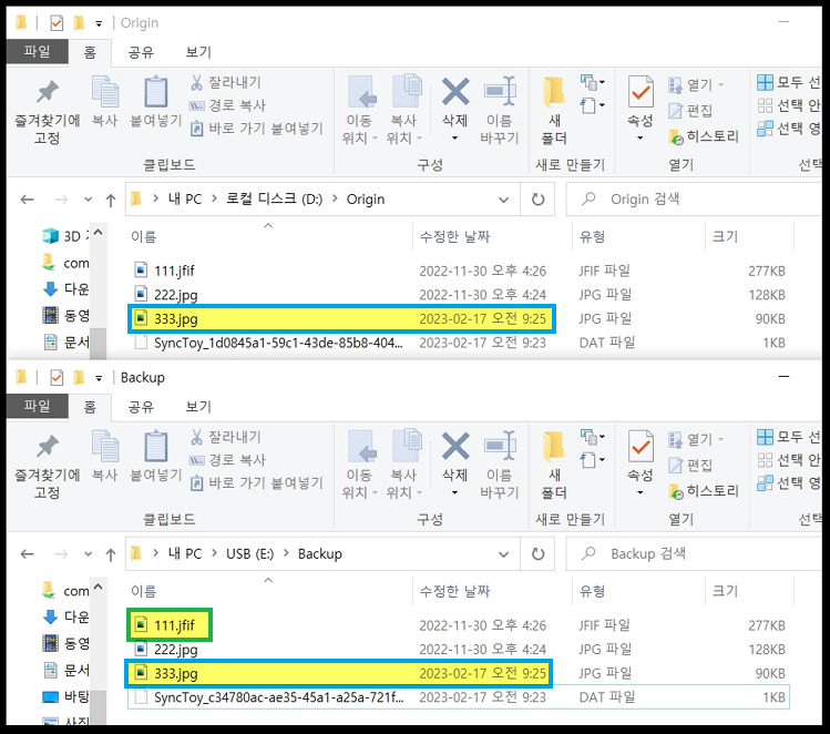그리고, 서로 수정된 날짜가 달랐던 "333.jpg" 파일이 왼쪽 폴더에서도 최근 수정된 날짜로 변경되었습니다.