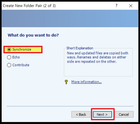 [Synchronize] 를 선택하고 [Next] 를 클릭합니다.