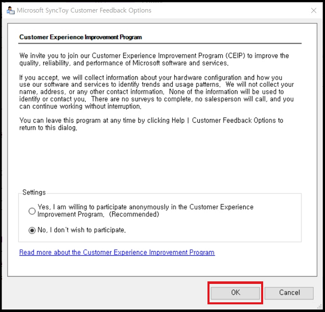 설치가 완료되고, 사용자 피드백 참여 여부를 묻는 창이 나옵니다. 아무거나 선택하고 [OK]를 클릭합니다.