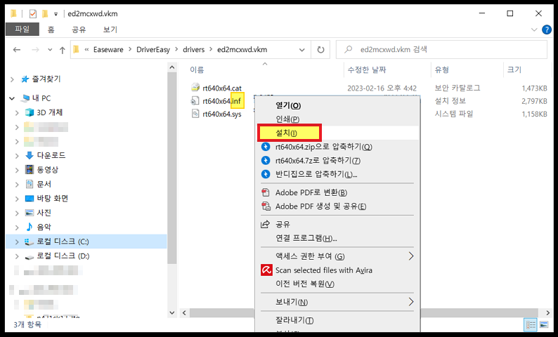 드라이버 파일이 저장된 폴더가 저절로 열립니다.