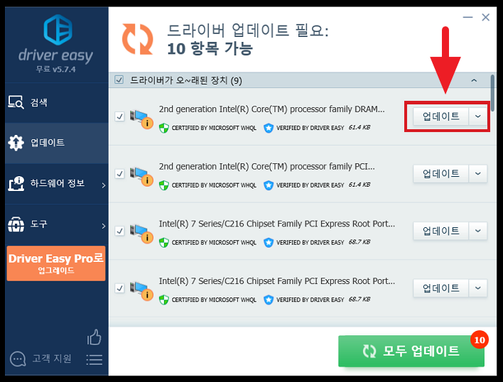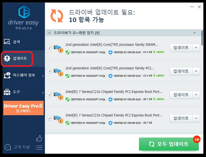 업데이트 메뉴를 선택하면, 내 PC에 Driver Easy를 통해 검색했던 드라이버 목록이 나옵니다.
