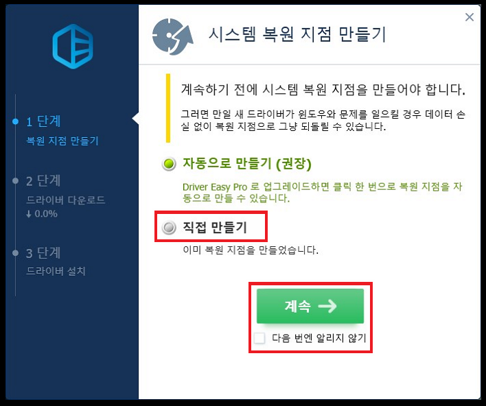 시스템 복원 지점을 만들라는 안내가 나옵니다.
