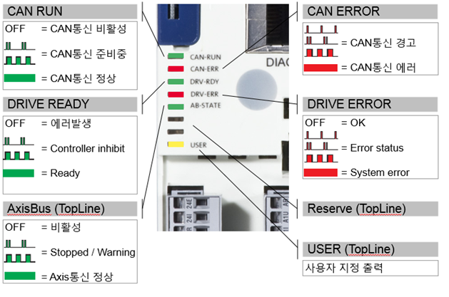 Lenze 8400 인버터, Lenze 9400 서보드라이브에는 제품 상태를 나타내는 여러 개의 LED 램프가 있습니다.