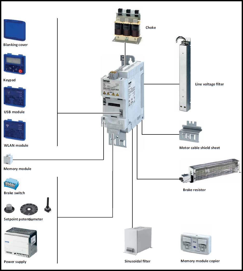 키패드, WLAN, USB, Safety function (STO), CANOpen, Modbus, EtherCAT, EtherNet/IP, PROFIBUS, PROFINET 등의 옵션이 장착 가능합니다.