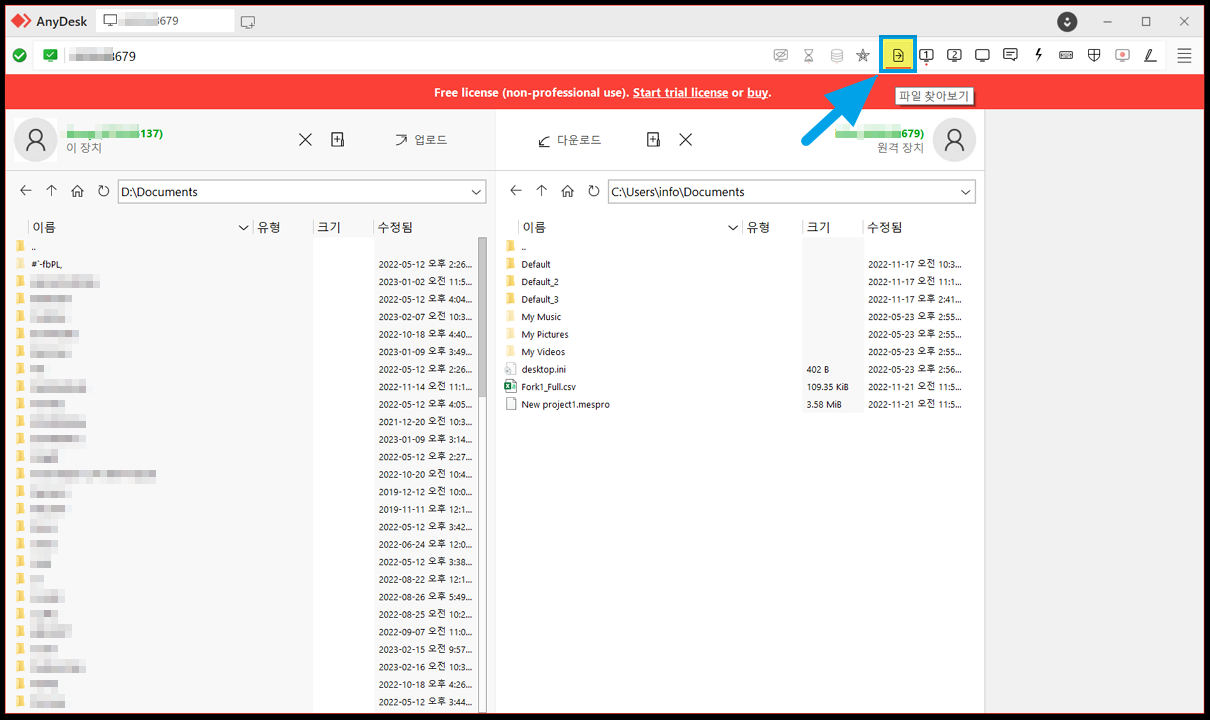[파일 찾아보기] 아이콘을 클릭했더니, 내 PC의 파일이 화면 왼쪽에 보이고, 상대방 PC의 파일이 화면 오른쪽에 보입니다.