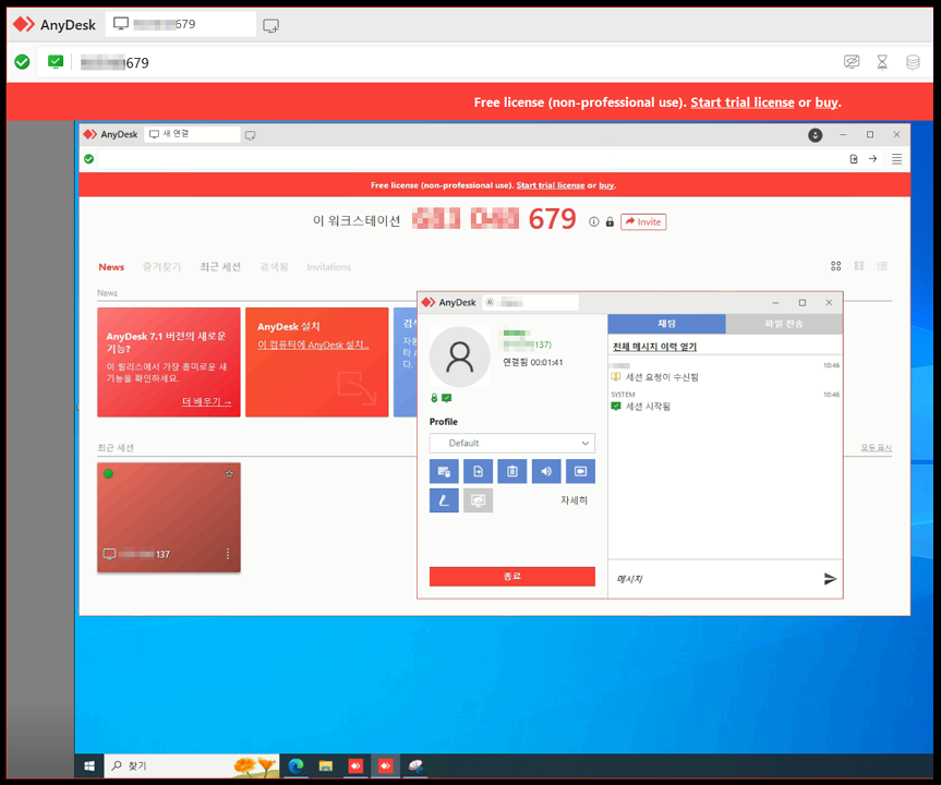 [AnyDesk 설치] 메뉴를 선택하지 않은 상태에서, 두 대의 PC를 이용해 원격제어 테스트를 해 보았습니다.