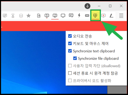 오디오 전송, 키보드 및 마우스 제어 등의 설정이 가능합니다.