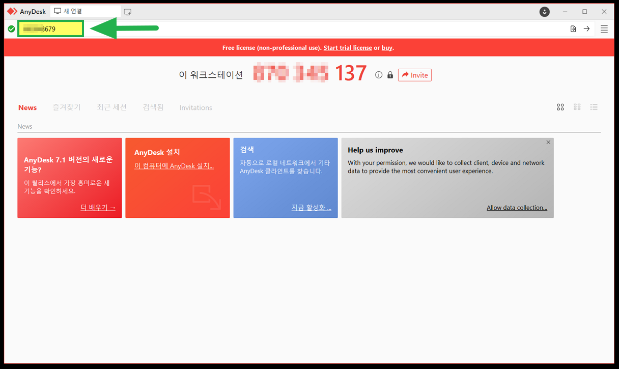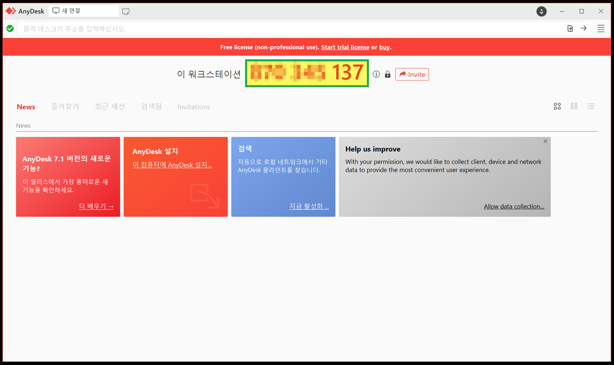 설치파일을 실행하자 내 PC 접속을 위한 번호가 상단에 보입니다.