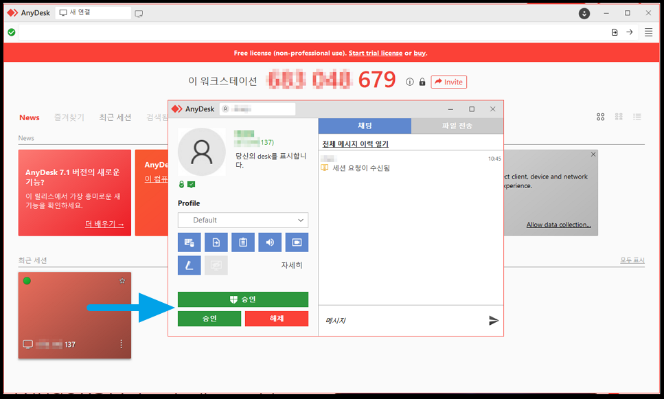 상대방 PC에서 [승인]을 클릭하자, 원격접속이 성공되었습니다.