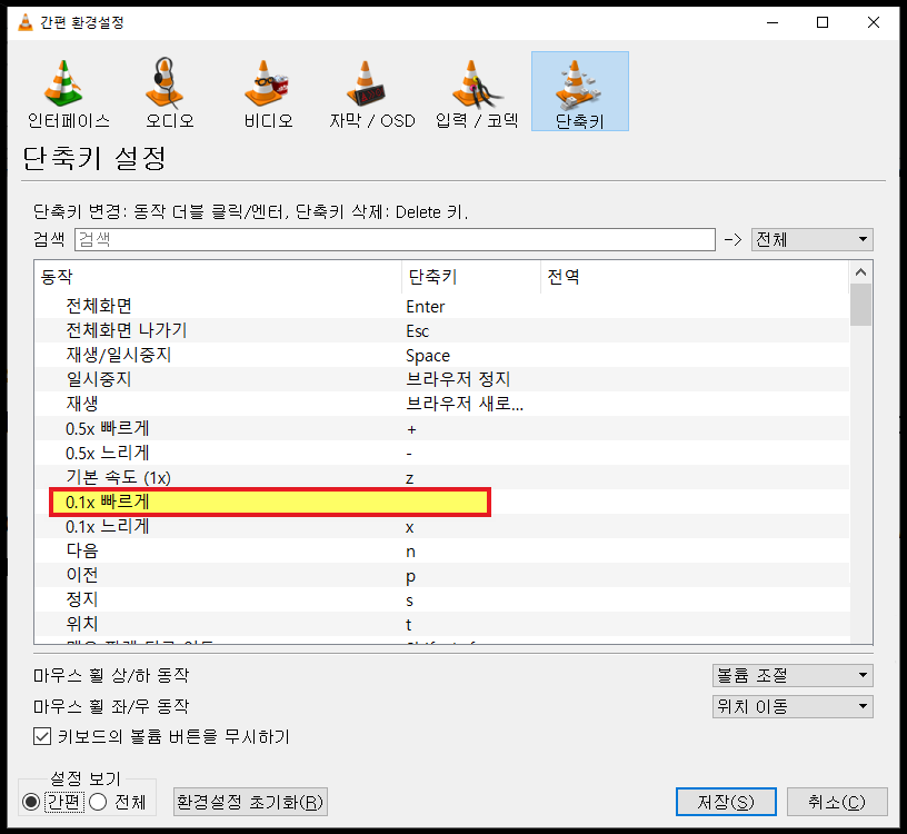 곰플레이어에서 주로 사용했던 "전체화면", "0.1x 빠르게", "0.1x 느리게" 에 대한 단축키를 동일하게 설정해 보았습니다.