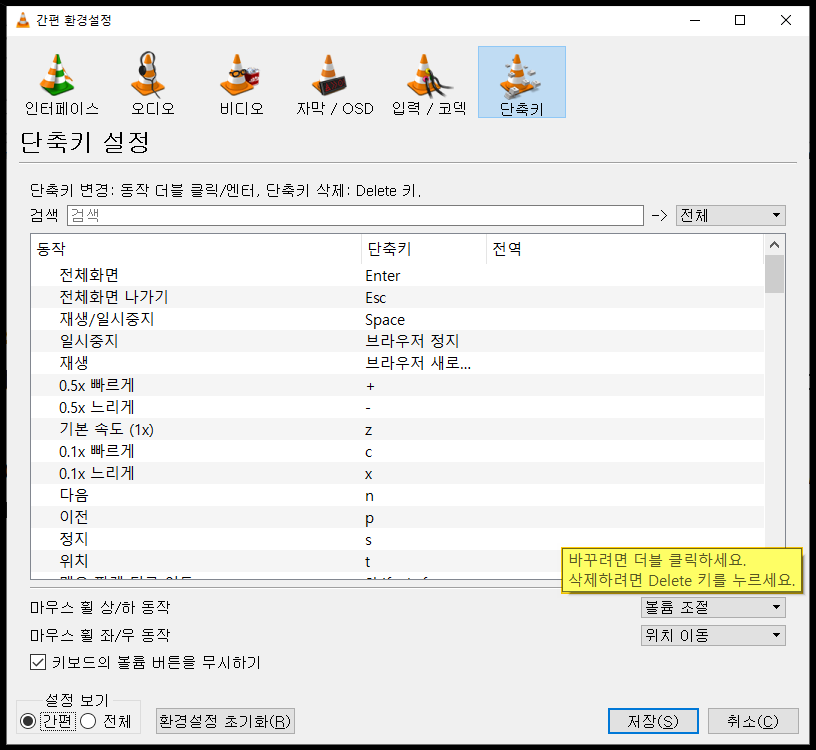 기존에 곰플레이어를 사용하던 저는 단축키를 많이 사용했는데, VLC media player는 기본 단축키가 많이 다릅니다.