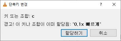 "0.5x 빠르게" 동작에 [c] 버튼을 할당하려고 했더니 경고창이 나타났습니다.