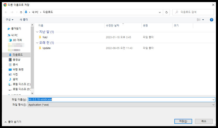경로를 지정하고, [저장]을 클릭합니다. 다운로드 받은 파일을 실행합니다.