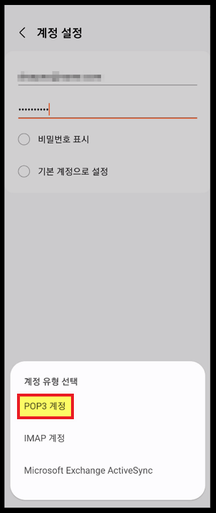 [계정 유형 선택] 항목에서 [POP3 계정]을 선택합니다.