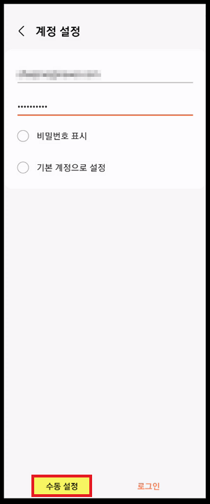 이메일주소와 비밀번호를 입력하고, 하단에 [수동 설정]을 클릭합니다.