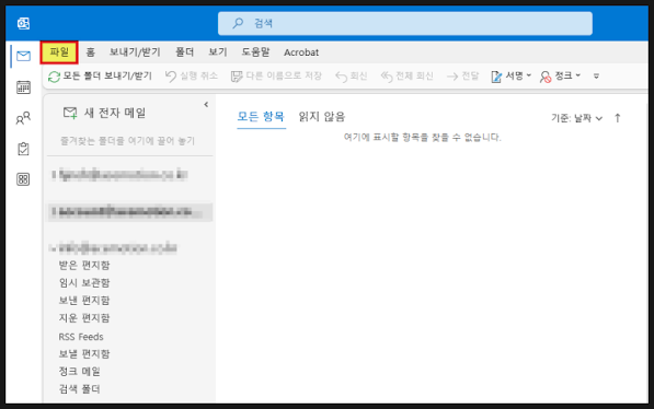 먼저 아웃룩에서 파일 메뉴로 들어갑니다.