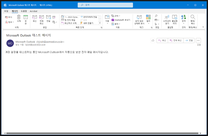 설정이 정상적으로 완료되면 아웃룩의 테스트 메일을 받아 보실 수 있습니다.