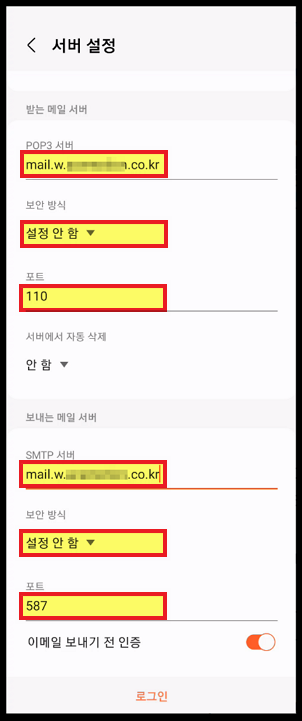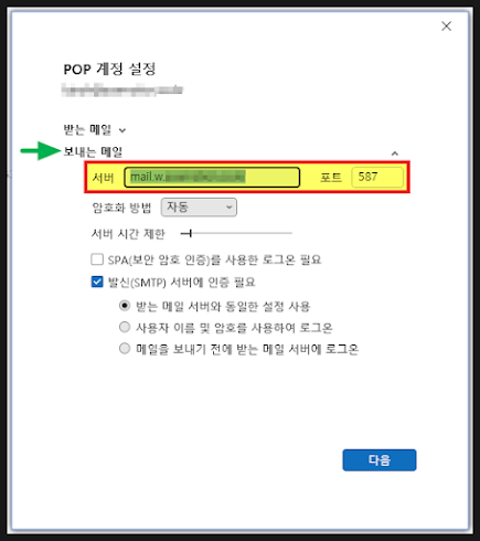 [서버] 에 "mail.w.도메인명", [포트] 에는 "587"을 입력합니다.