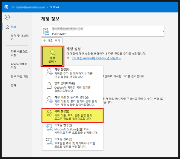 [계정 설정] 메뉴를 클릭하면 나오는 하위 메뉴 중에 [서버 설정(S)]을 선택합니다.