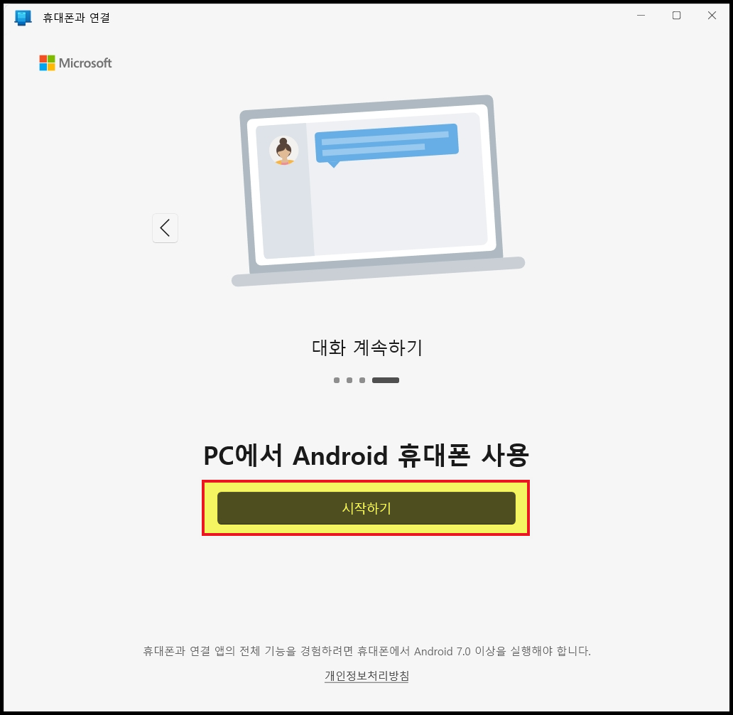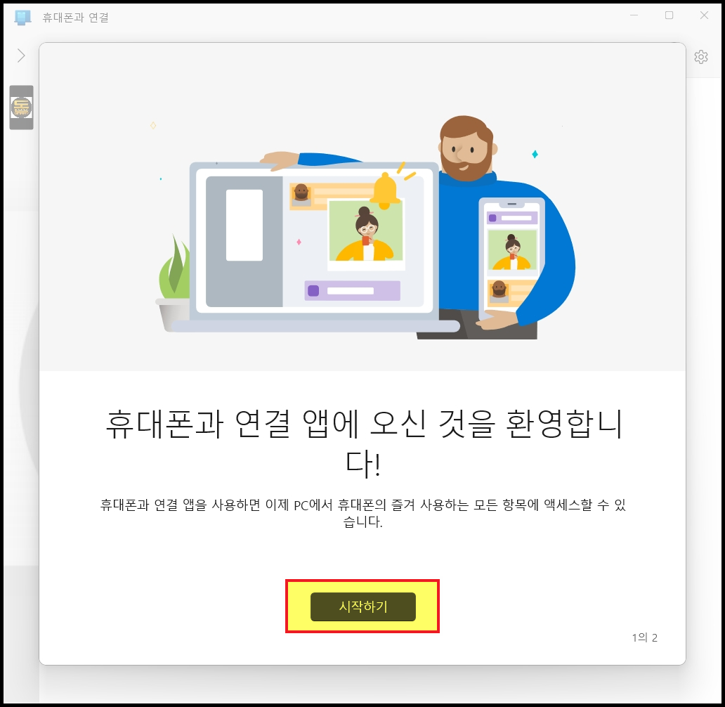 PC와 휴대폰을 연결하기 위한 화면이 나타납니다. [시작하기] 를 클릭합니다.