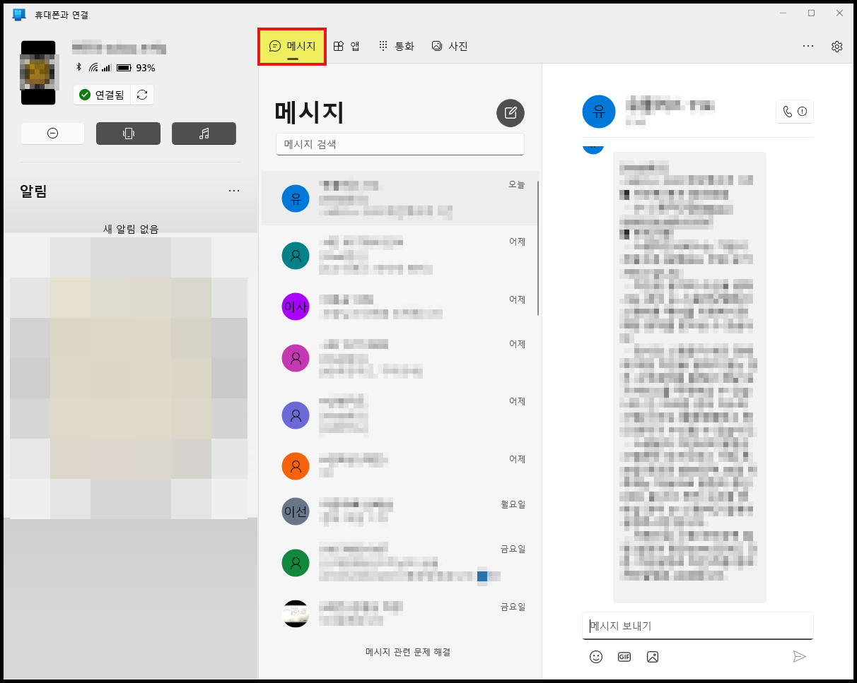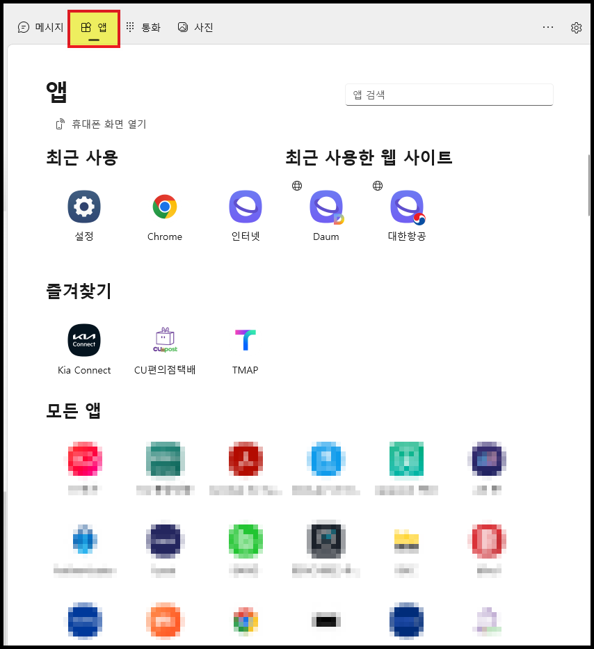 [앱] 화면에 있는 [휴대폰 화면 열기] 를 클릭하면, 내 휴대폰 화면을 그대로 컴퓨터에서 볼 수 있습니다.