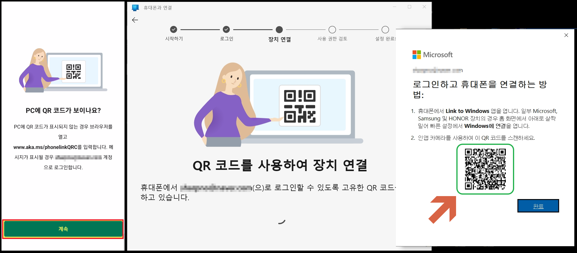 휴대폰 앱 화면에는 "PC에 QR 코드가 보이나요?" 메시지가 나타나고, 컴퓨터 앱 화면에는 QR코드가 나타납니다.