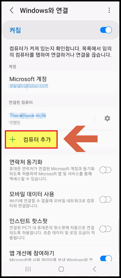 휴대폰 앱이 실행되면, "컴퓨터 추가" 메뉴를 누릅니다.