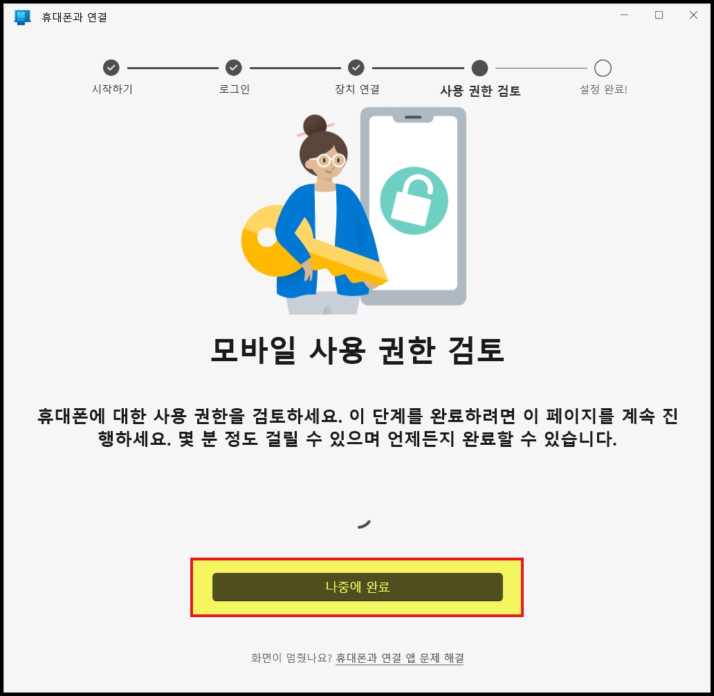 컴퓨터 앱 화면에는 "모바일 사용 권한 검토" 메시지가 나타납니다.