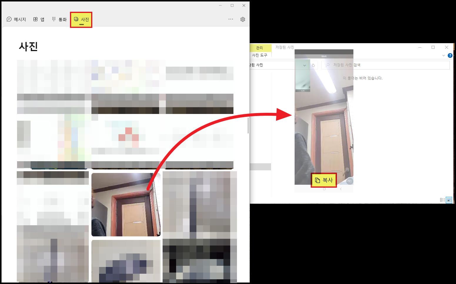 마우스로 사진을 드래그하면 컴퓨터에 사진을 복사할 수 있고,