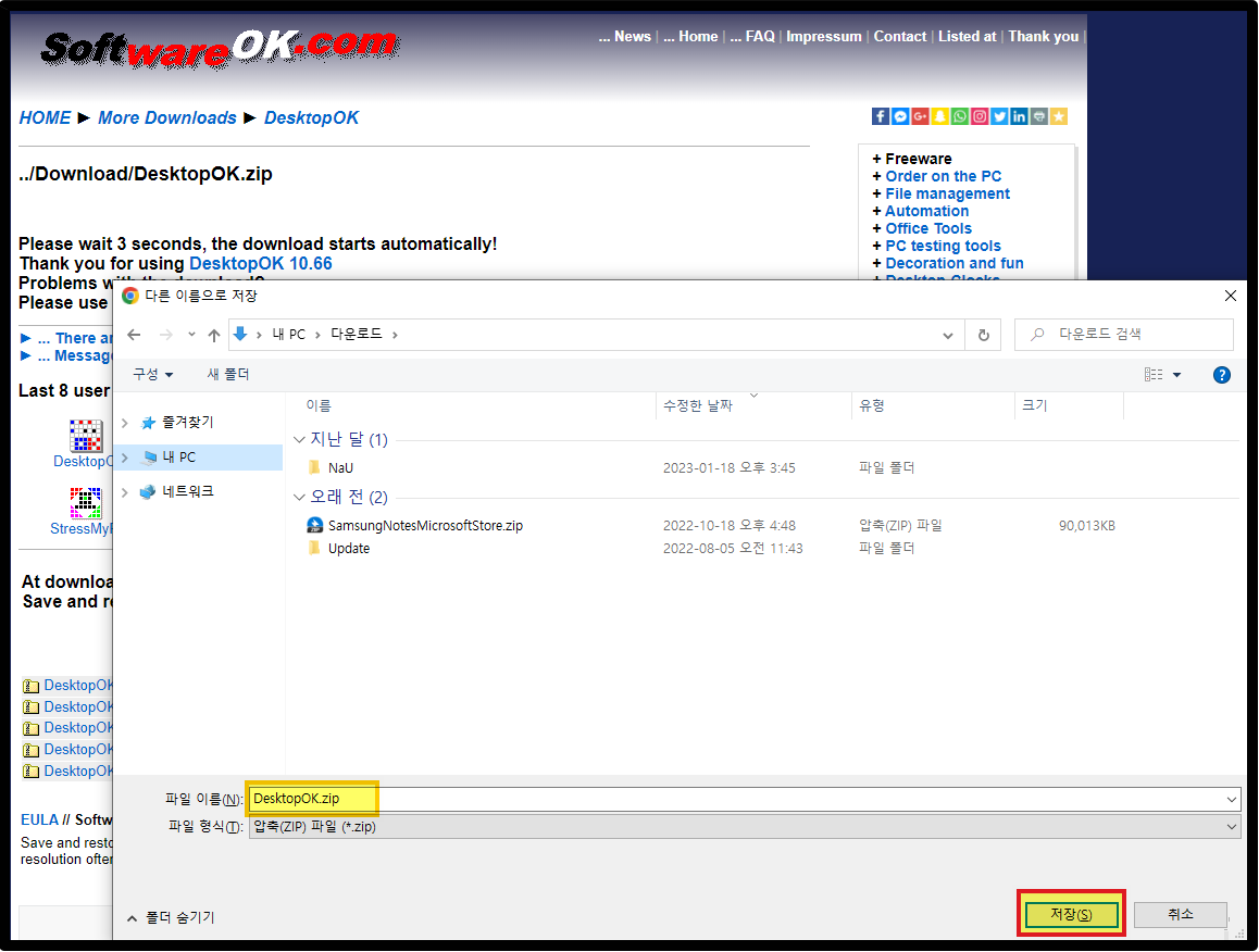 [DesktopOK.zip] 파일을 클릭하면 약 3초 후에 저장경로를 설정하기 위한 새로운 창이 나타납니다.