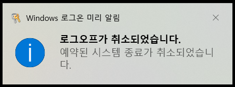 이와 같이, 재시작 예약이 취소되었음을 알려주는 알림 창이 나타납니다.