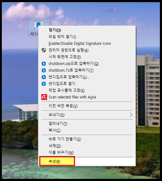 [시스템종료] 아이콘 위에 마우스 커서를 올려놓고, 마우스 오른쪽 버튼을 누릅니다.