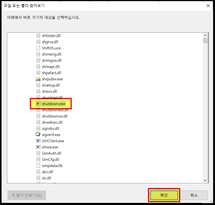 이 폴더경로를 따라 찾아가서 아래로 쭈욱 내리다가 [shutdown.exe] 파일을 찾아 선택하고 [확인]을 클릭합니다.