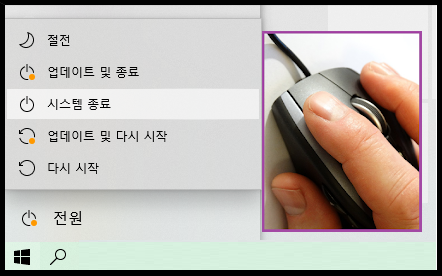 [시스템종료] 아이콘 위에 마우스 커서를 올려 놓고, 마우스 오른쪽 버튼을 누릅니다.
